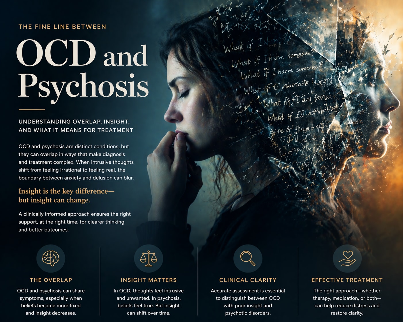 Ultimately, while the overlap between OCD and psychosis can be complex, it is also manageable with appropriate psychological and psychiatric care. With careful assessment and evidence-based intervention, individuals can regain clarity, reduce distress, and re-establish a sense of control over their thoughts and experiences.