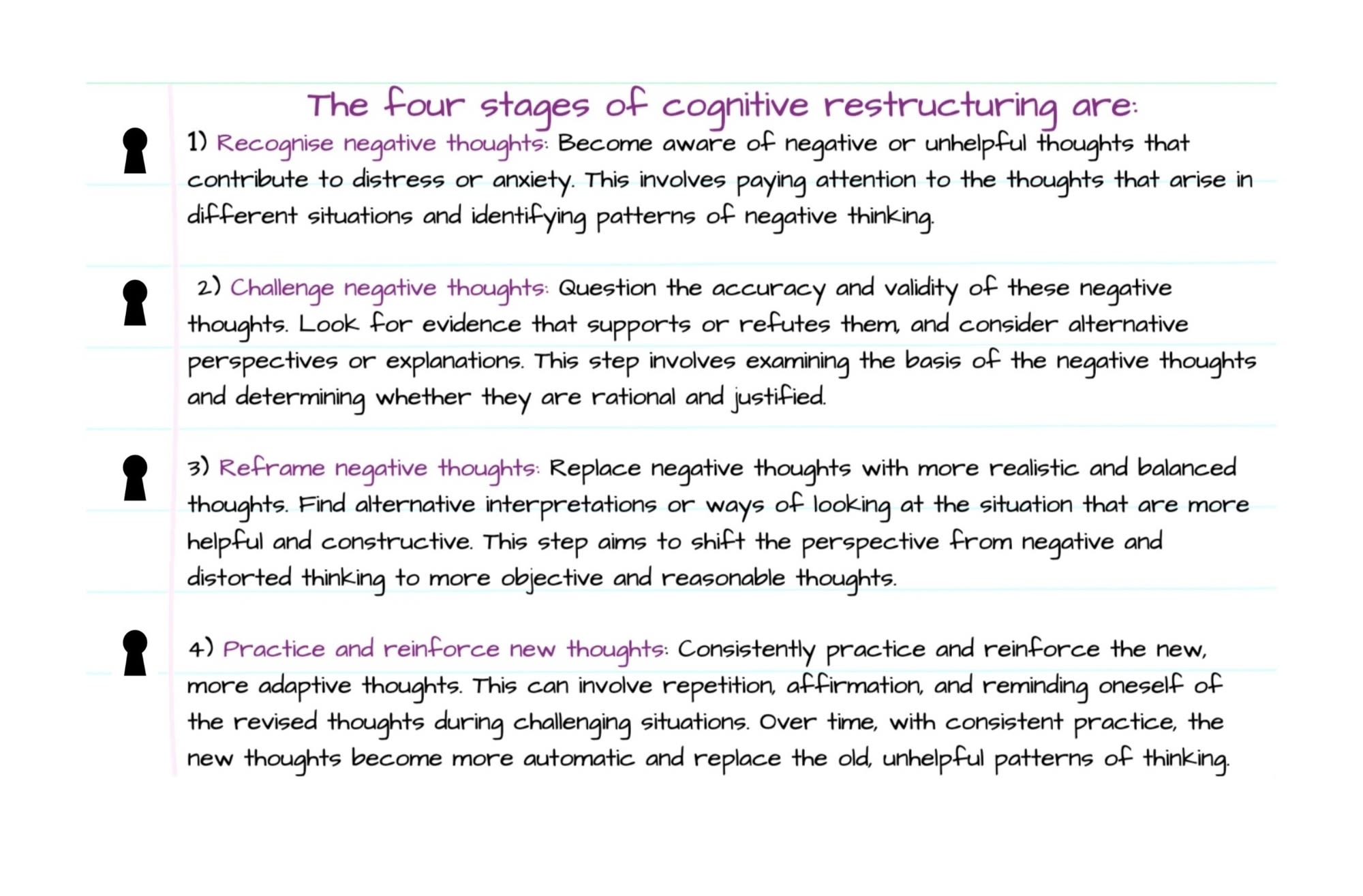 The process of cognitive restructuring involves four key steps. First, it's crucial to recognise negative thoughts and become aware of how they impact our emotions. Next, we challenge these negative thoughts by questioning their accuracy and searching for evidence that supports or contradicts them. This allows us to gain a clearer perspective on the situation.