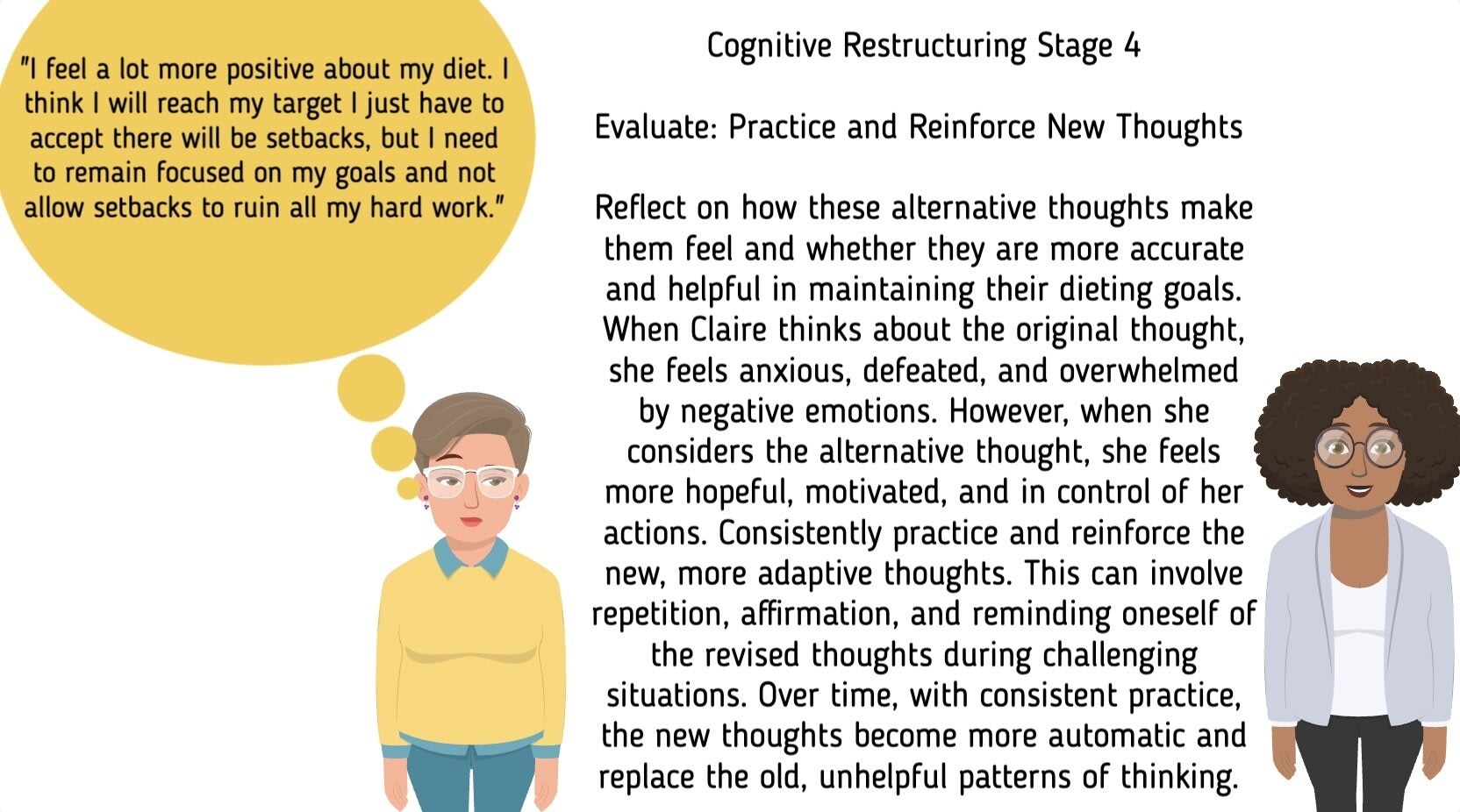 Answer: It's perfectly normal for some anxiety to persist even after engaging in cognitive restructuring and reframing your thoughts. For example, Claire's anxiety score is still high at 60% after cognitively reframing the situation. Cognitive restructuring is a helpful technique, but it may not eliminate all anxiety immediately. Anxiety is a complex emotion, and it can be influenced by various factors.